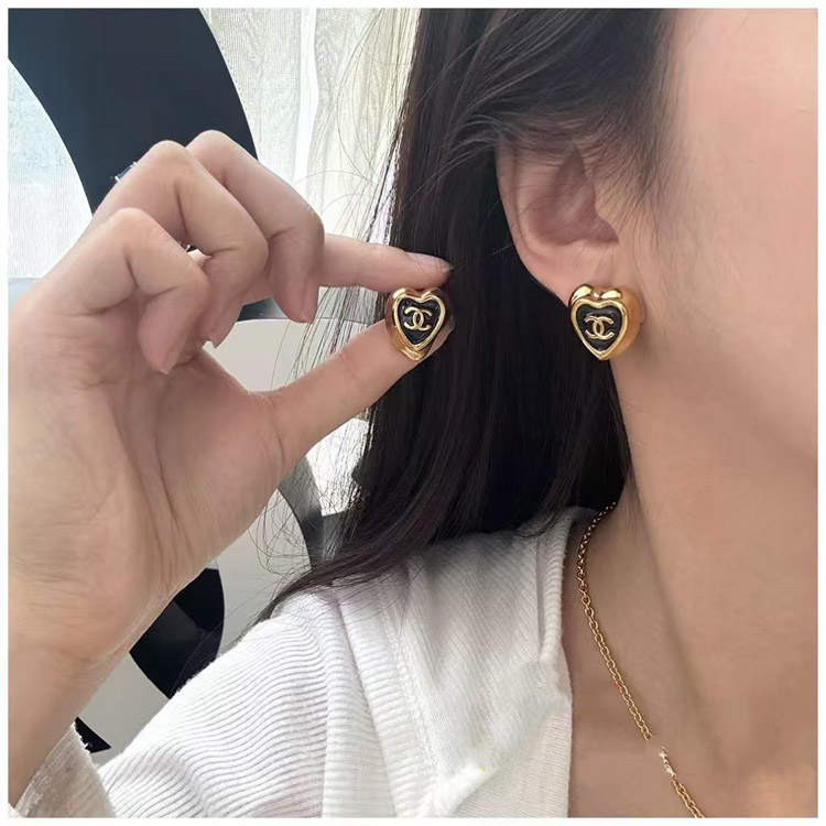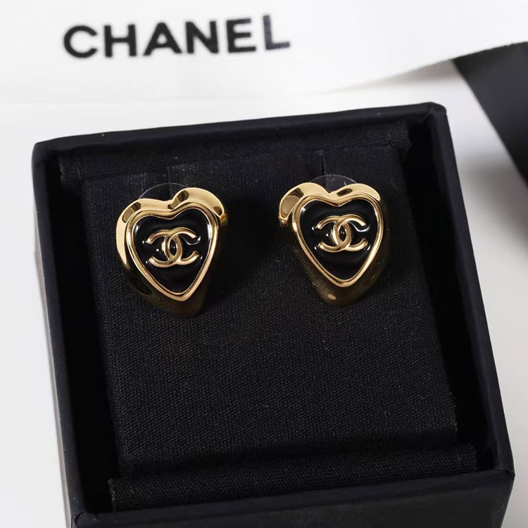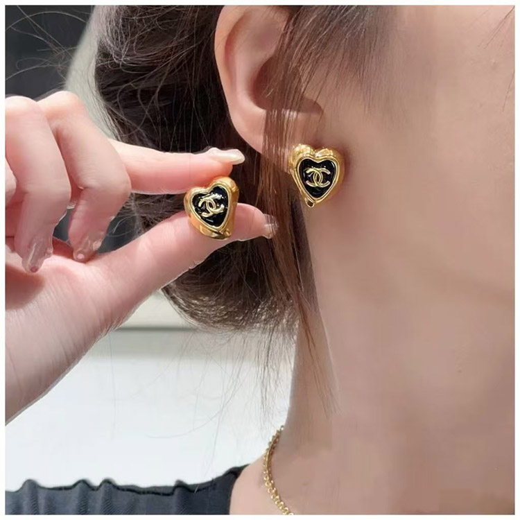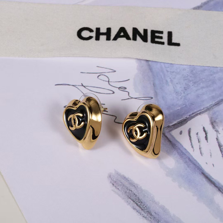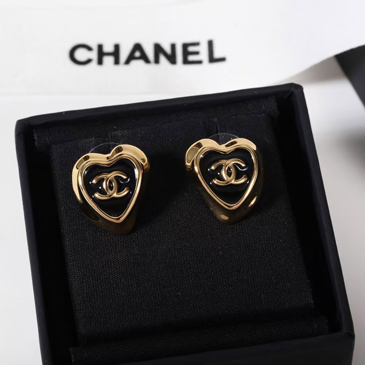 Chanel black enamel love double C gold edge earrings-3739